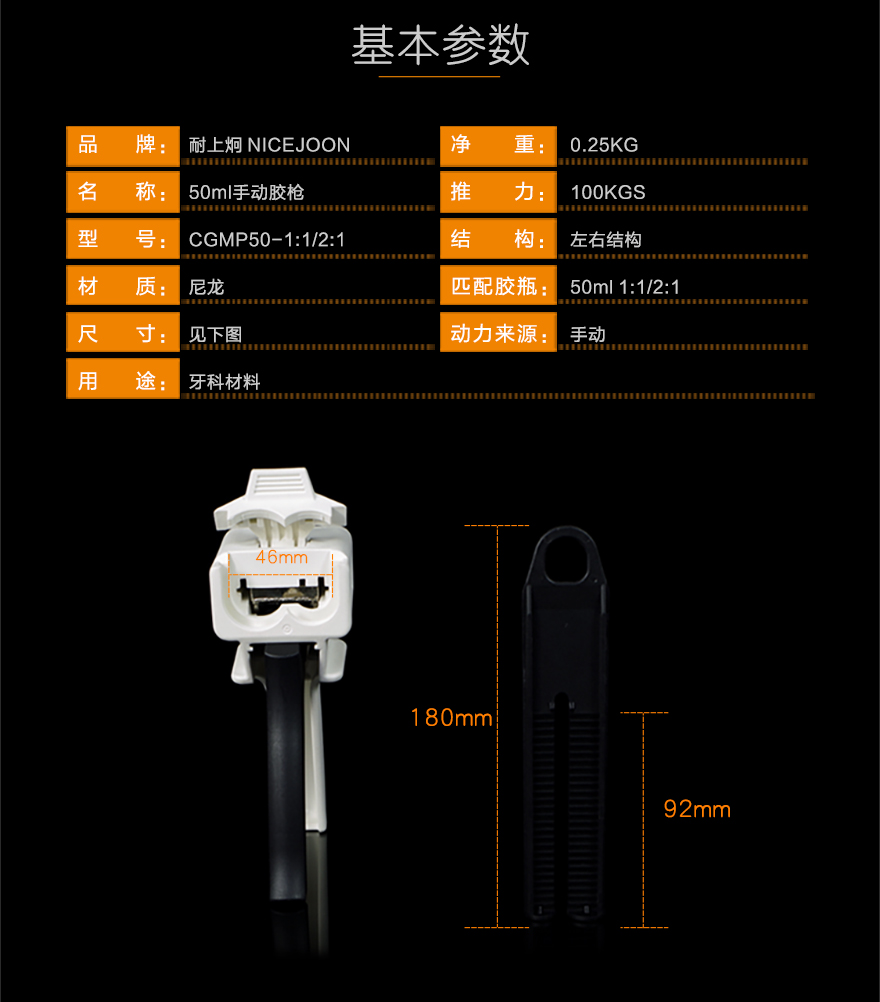 产品型号:50ml1:1/2:1牙科胶枪